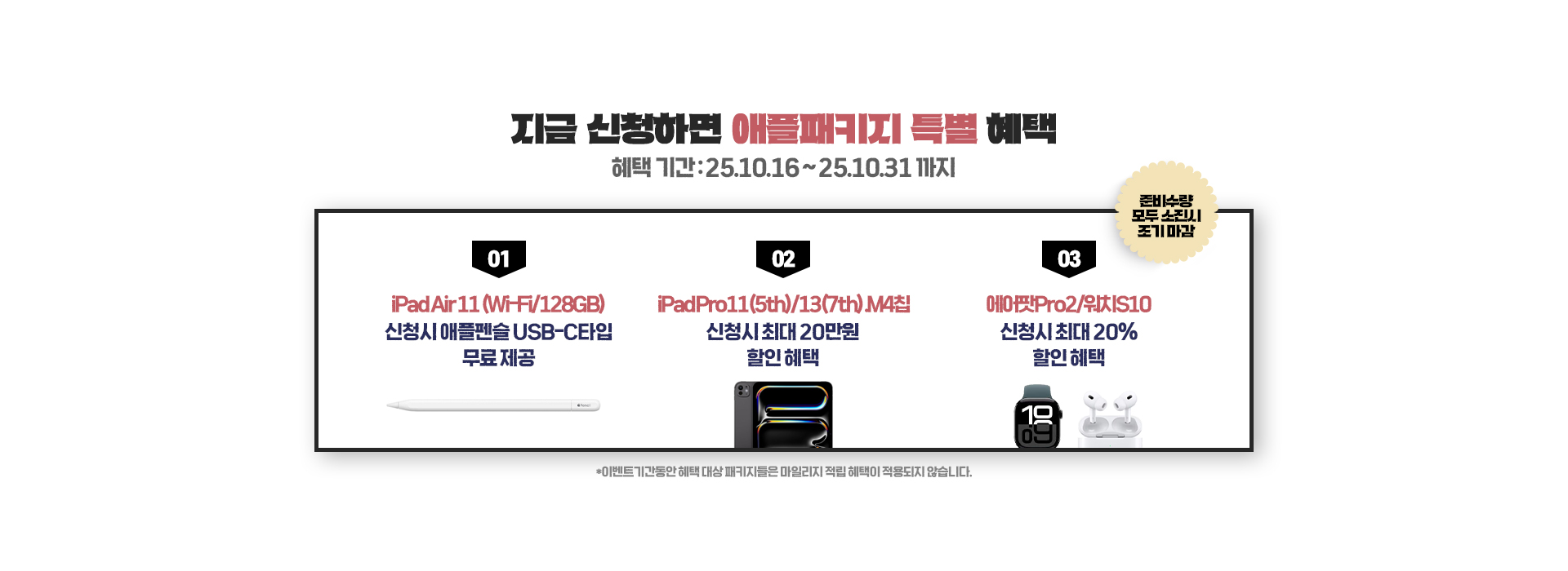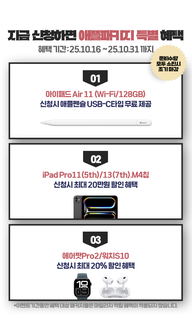 *이벤트기간 아이패드 Air 11 (Wi-Fi/128GB) 패키지의 마일리지 적립 혜택은 진행되지 않습니다.