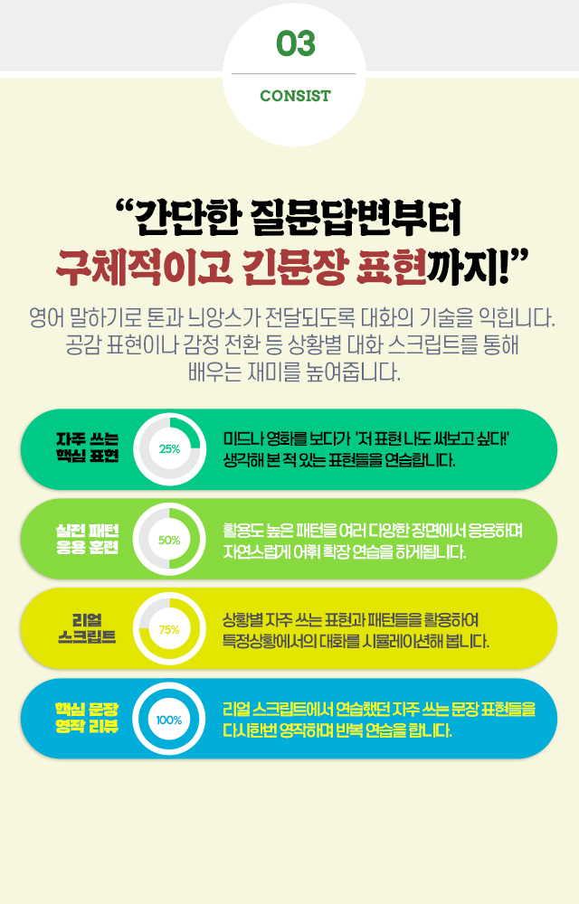 최정*강의 듣기 시작한지 이제 2달쯤 된 것 같아요. 애초의 각오와는 다르게 매일매일 듣고 있지는 못해요...그래도 강의 듣다보면 대화형태로 구성되어 있다보니 이해하기도 쉽고 간단하게 적용되다보니 영어가 생각보다는 쉬운데?라는 생각도 들어요.^^재미있다보니 포기하지 않고 남은기간동안 꾸준히는 들을 생각이에요.강좌명은 리얼패턴이지만 패턴뿐만 아니라 상황별로 쓸수 있는 표현들도 함께 구성되어 있어서 너무 좋은 것 같아요. 지금도 상황별로 많이 강의가 있지만 앞으로도 계속해서 업데이트 해주시면 너무 좋을 것 같아요.