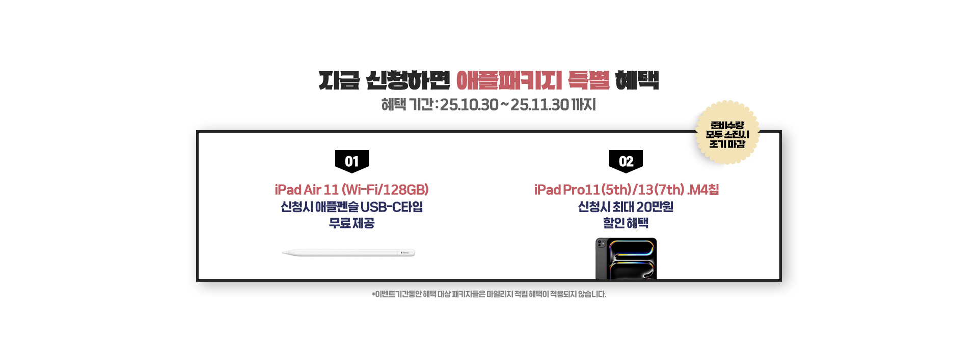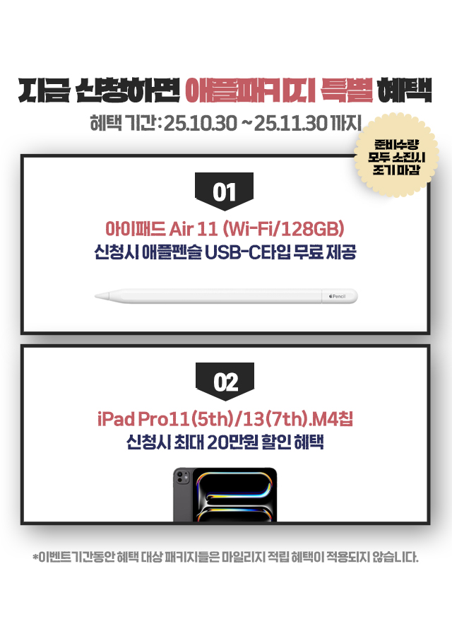 *이벤트기간 아이패드 Air 11 (Wi-Fi/128GB) 패키지의 마일리지 적립 혜택은 진행되지 않습니다.