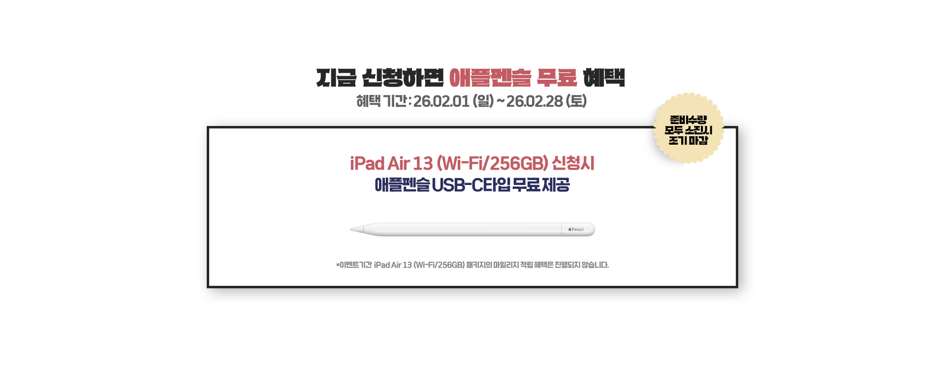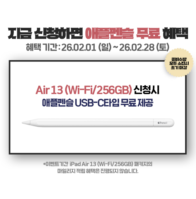 이벤트 혜택 : iPad Air 13 (Wi-Fi/256GB/S.Gray) 신청시 애플펜슬 USB-C타입 무료 제공