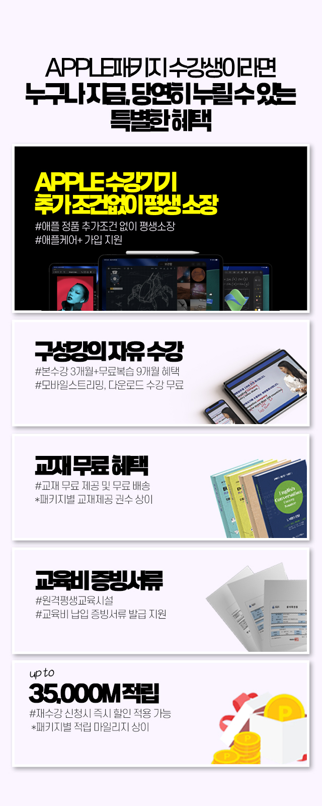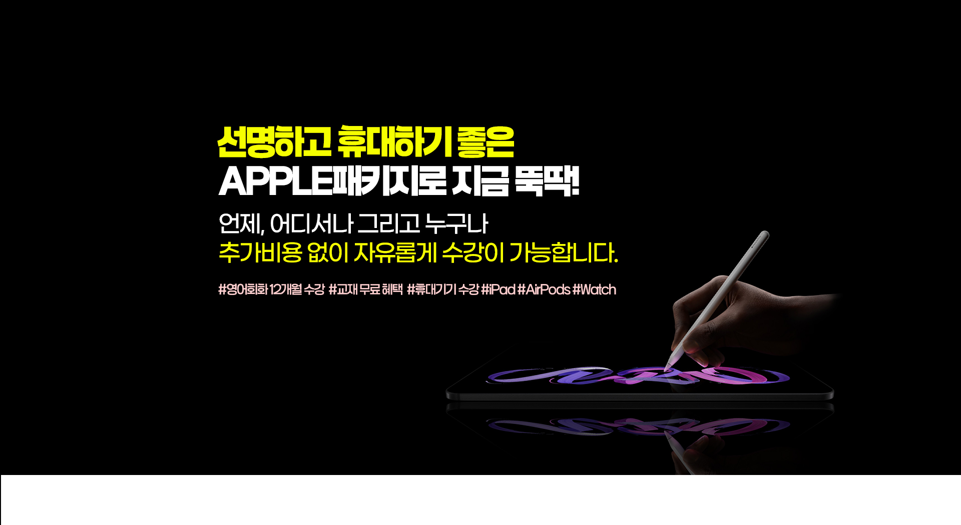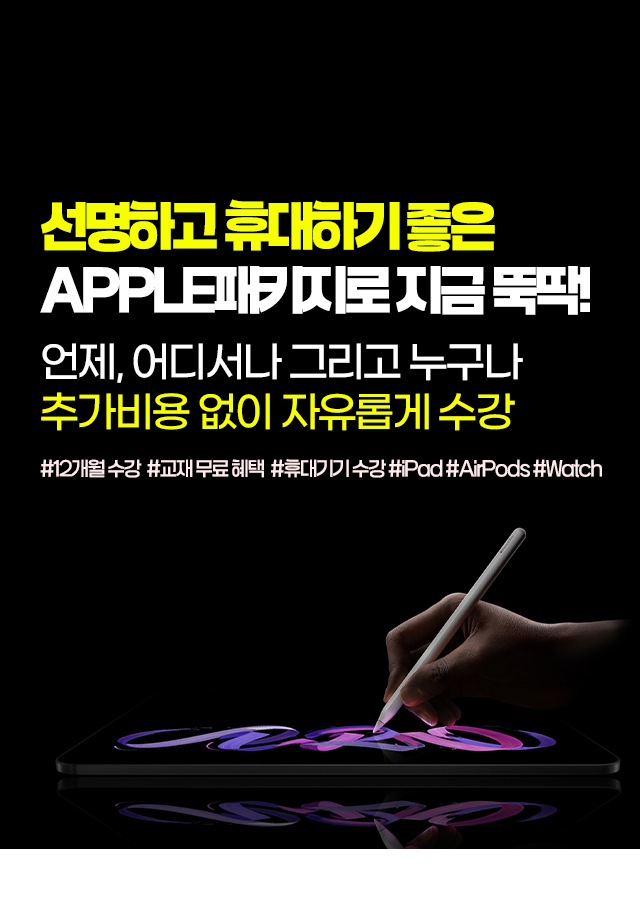 Apple패키지는 기기에 강의가 내장되어 발송되지 않고 학습기간 동안 자유롭게 스트리밍, 다운로드하여 수강하는 상품입니다.