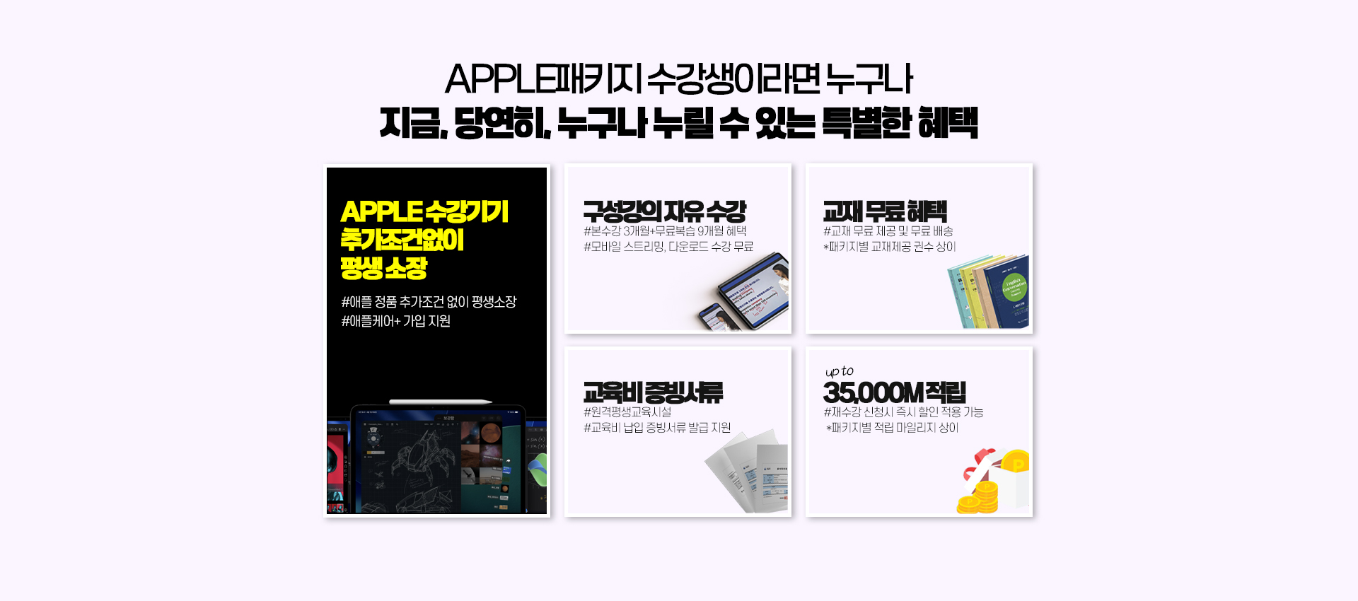 Apple패키지 디바이스별 구성되어있는 강의는 상이하며 패키지별 스펙버튼 클릭 후 포함 강의를 확인 해 주세요.